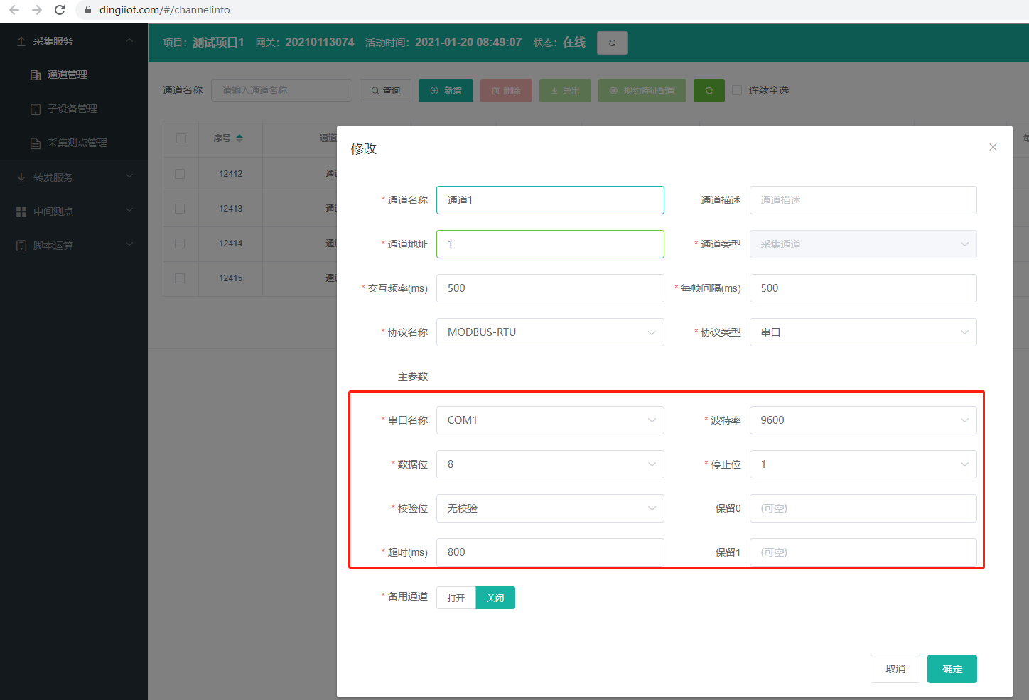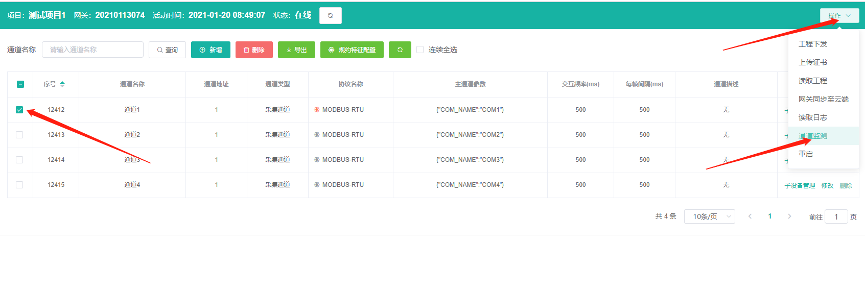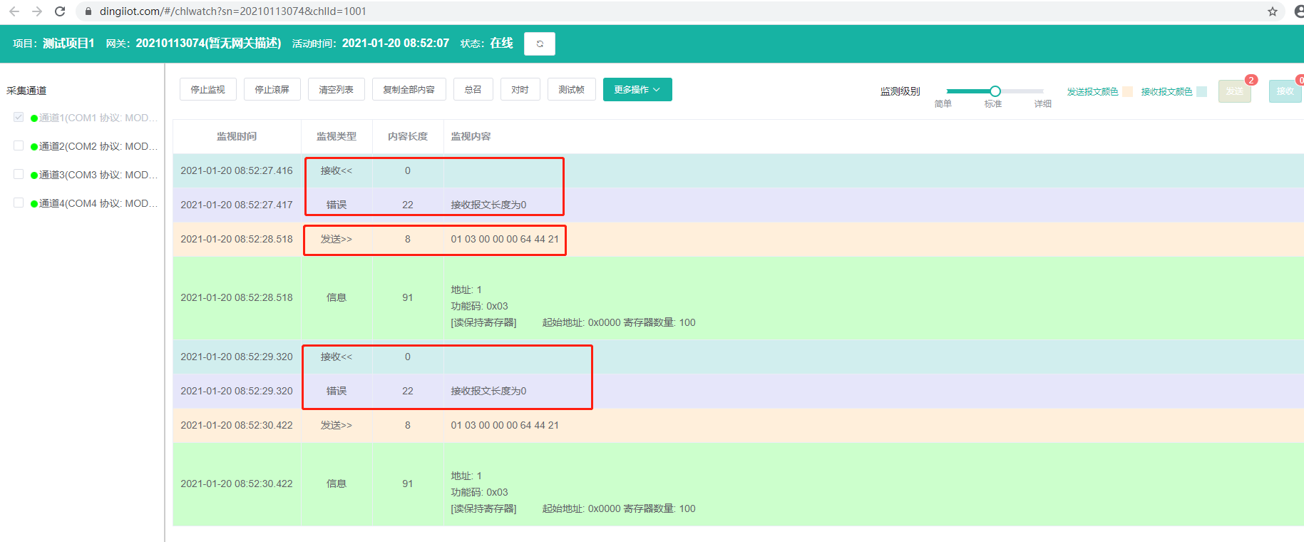 2、釘工云,打開網(wǎng)關(guān)列表->組態(tài),在采集通道服務(wù)的通道管理界面,選中要查看的通道,點擊右上角的操作->通道監(jiān)測,跳出通道監(jiān)測報文界面,可查看到數(shù)據(jù)發(fā)送與接收過程。